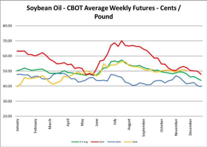 Soybean oil prices remained relatively firm but closed weaker by week’s end. The market is balancing weak exports, policy ambiguity around biofuels, and cost competition from heating oil—while underlying support persists via biofuel demand and U.S.-China trade recovery.