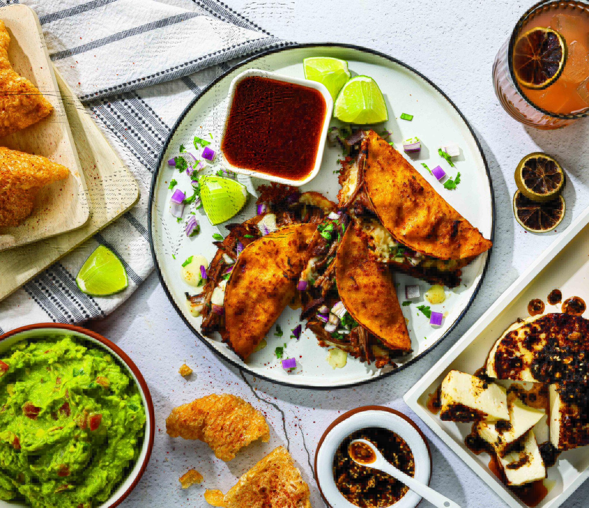 - To build the tacos, dip 3 tortillas in the fat from the birria consommé and place on the flat top. Place 2.5 ounces of the birria on each tortilla and spread the cheese. Sprinkle with cilantro and red onion. Once the cheese begins to melt, close the tortillas and sear on each side for 1 min.