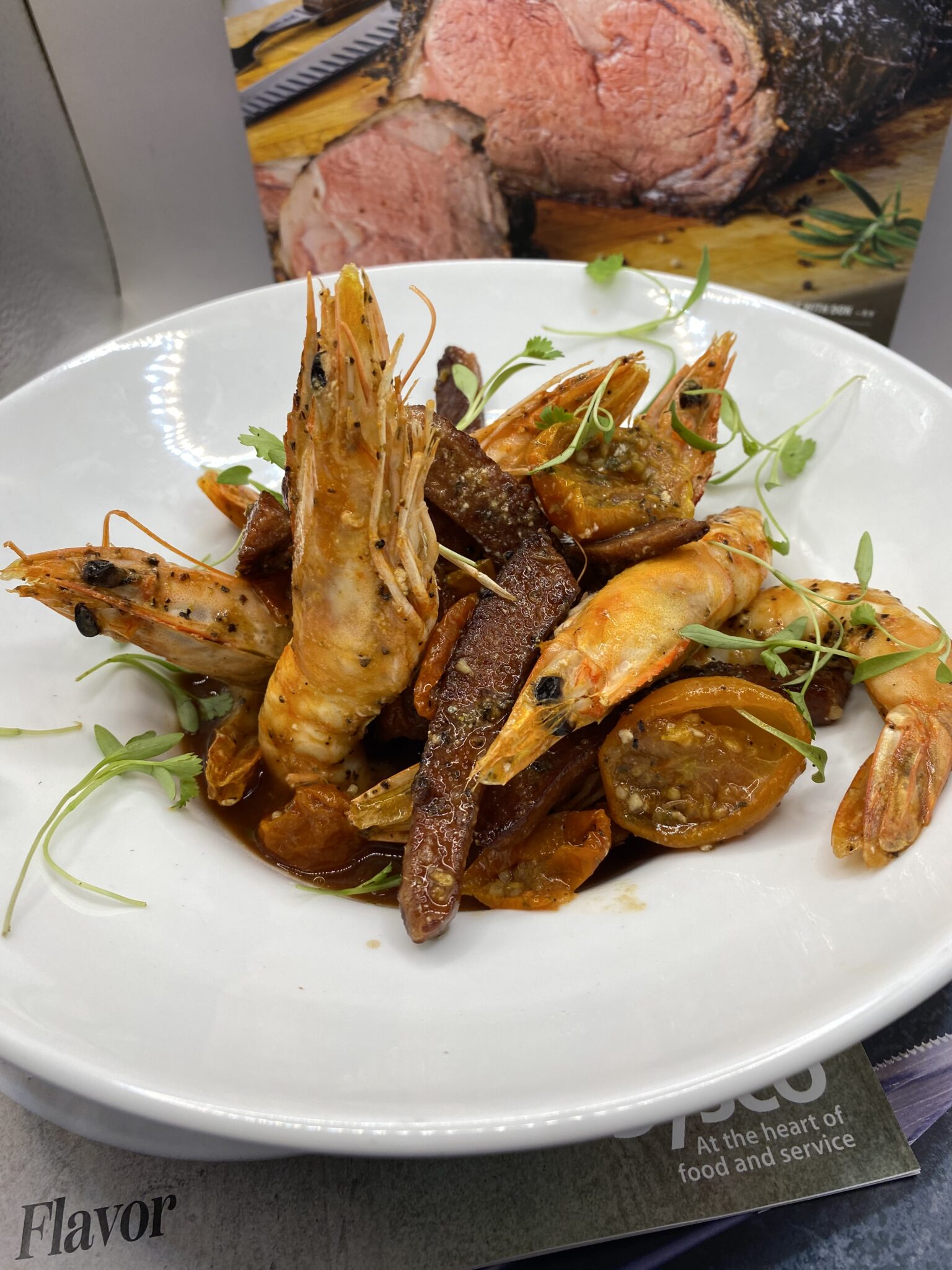 - Plate - Present in a white bowl, 5 Portico Bikini Shrimp, 6 Strips All Beef Burnt End Sausage, 7 Tomato Wedges, 6oz of Zing Zang, all mixed together and try to build up giving the dish some height. Garnish top with Micro Cilantro.