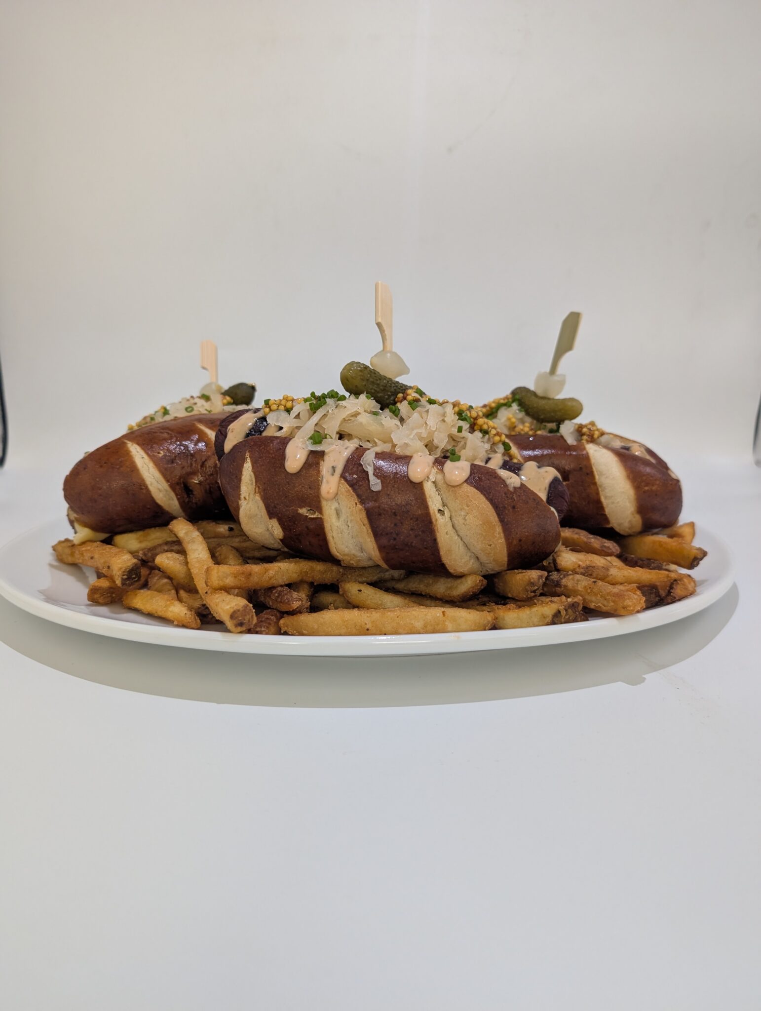 - Add the 1000 island dressing. Top with sauerkraut and pickled mustard seeds. Add skewered cornichon on top.
