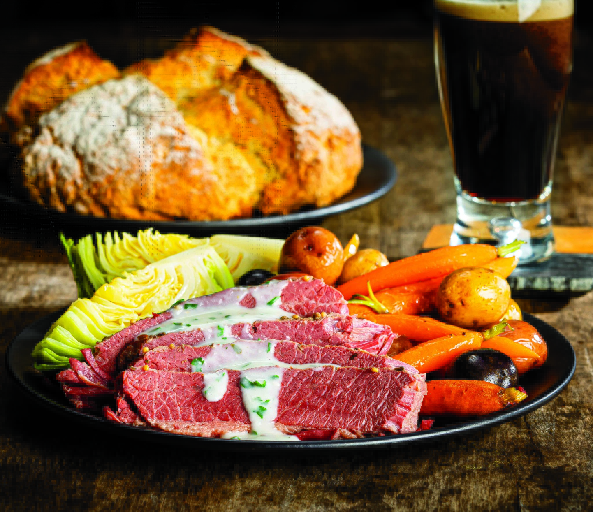 - To make the gravy, in a pot melt the butter and add flour and mix well but make sure not to get any color. Add milk and 8 oz of your reserved poaching liquid. Bring to a simmer to cook out the flour taste for about 15 min. Season with salt and white pepper to taste and garnish with chopped parsley. Set aside. To plate, slice the brisket against the grain place on the plate as the picture above with the vegetables and ladle the gravy on top of the corned beef.