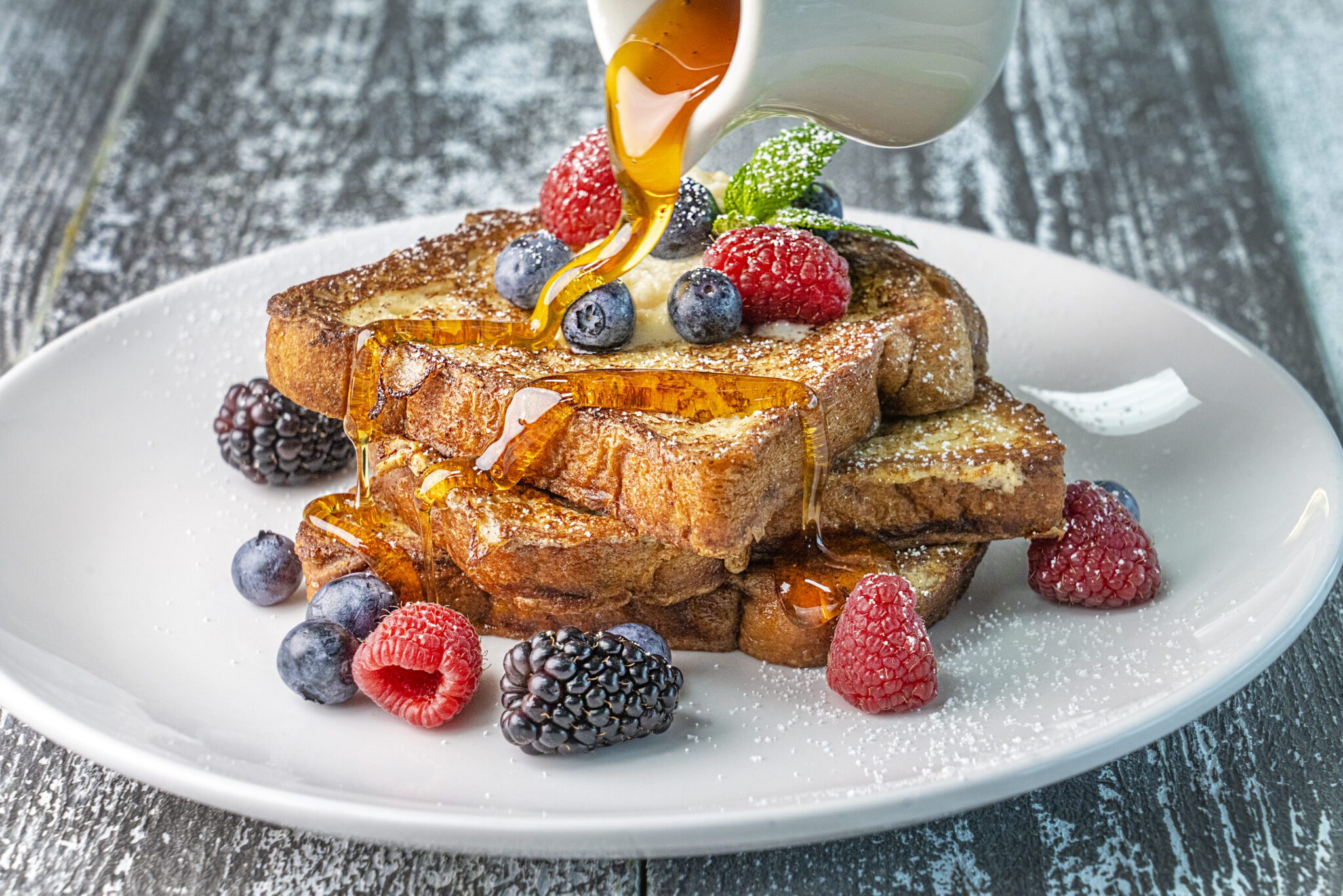 - For the plate, stack the French Toast on the plate and garnish with the fresh berries and the maple ricotta. Finish with the powdered sugar, the remaining maple syrup and mint.