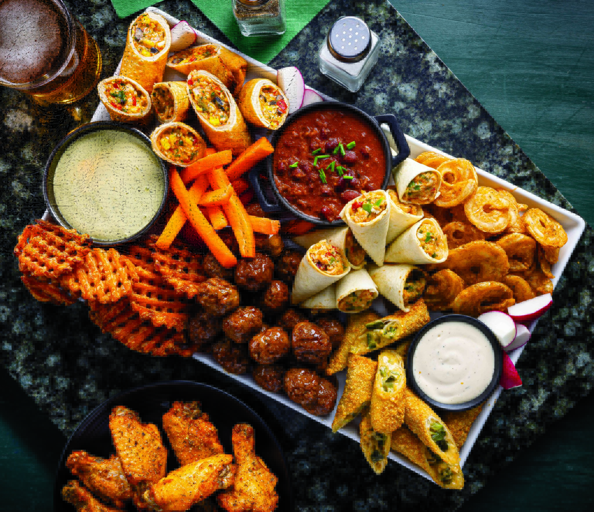 Deep fry the spring roll Chile relleno, swirl fry, waffle waffle fry, meatballs, chicken wings, and Santa Fe eggrolls drain well and reserve hot. While frying the meatball in a nonstick pan add the Firecracker sauce and have it on low heat, add the meatball to the pan and deglaze it with the lime.