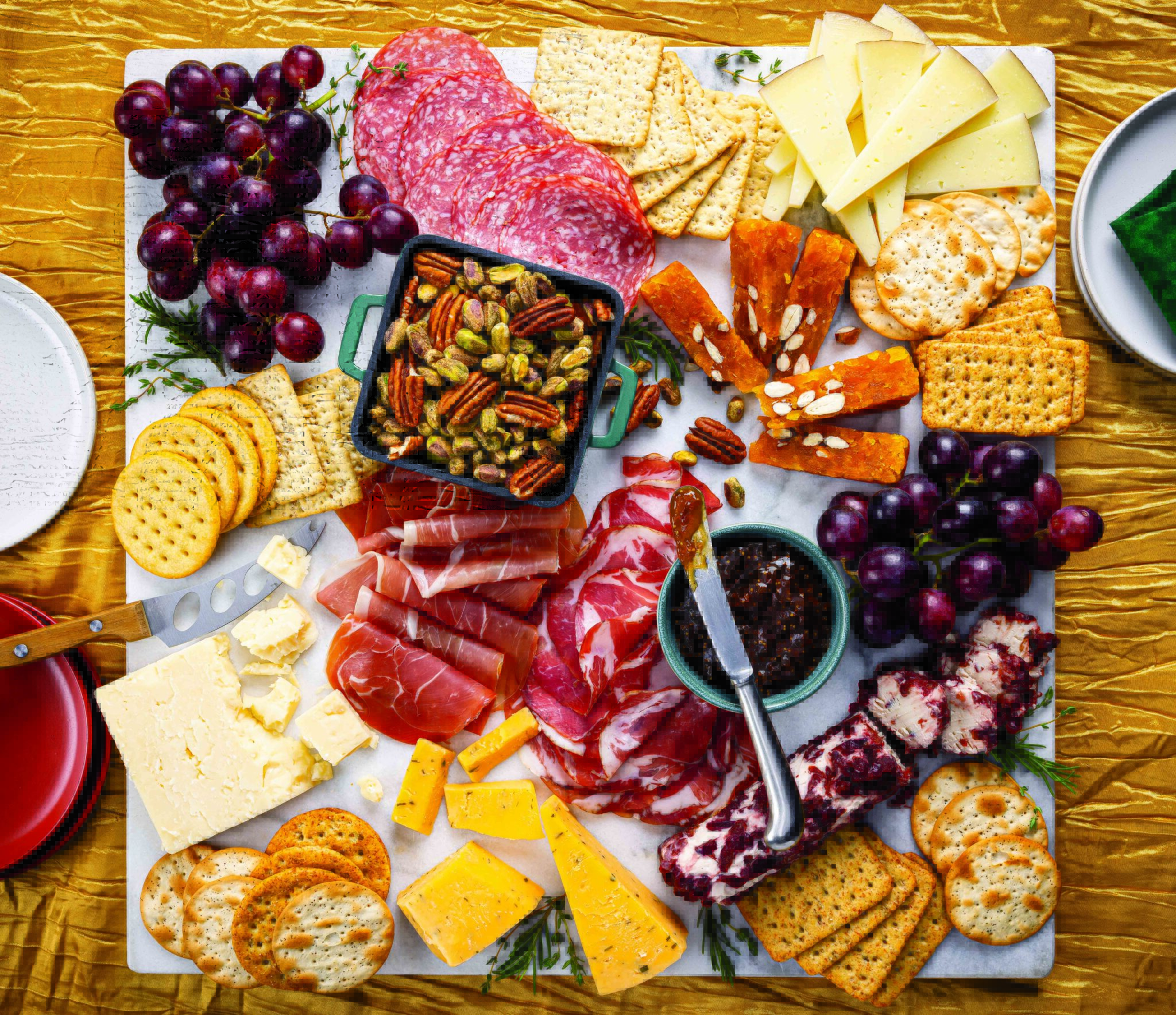 - Slice all the cheeses into different shapes or sizes about 8 ounces of each. On a large platter or cutting board begin arranging the cheeses, nuts, fruit, and meats. Garnish with the crackers and fill in the wholes with the herbs as needed.