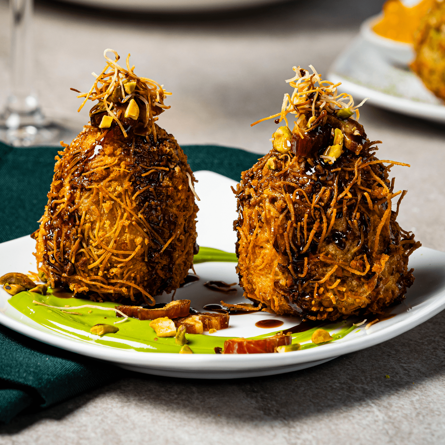 - Serve rice pudding topped with pistachios, pistachio paste, phyllo and remaining ½ of the dates drizzled with pomegranate molasses.