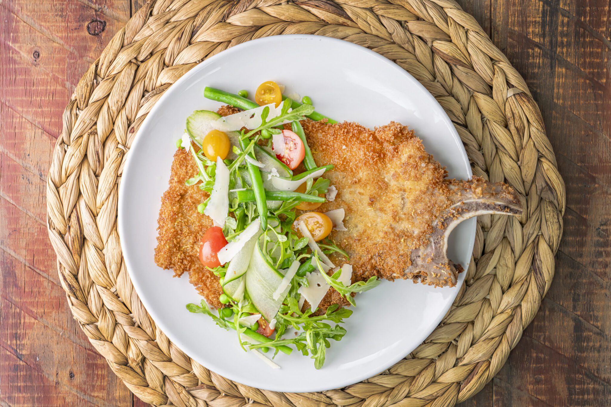 - Pan fry the breaded pork chop in a pan with the tallow and cook for 2 minutes each side. Remove from pan and drain very well. Arrange the salad on the pork chop. Garnish with shavings of the Parmesan cheese.