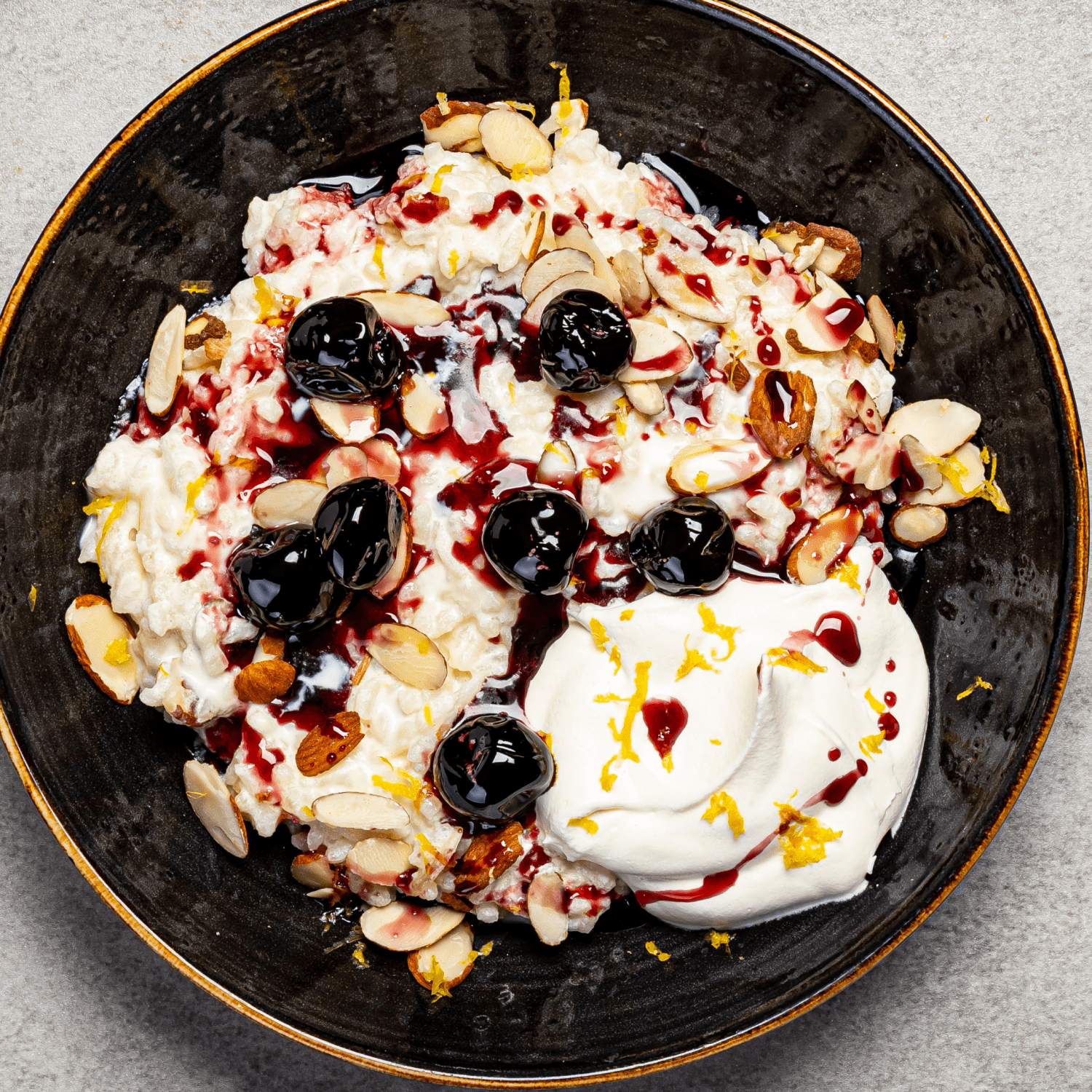 - Serve rice pudding at room temperature garnished with whipped cream, cherry liquid, cherries, remaining half of the almonds, mint, and lemon zest.