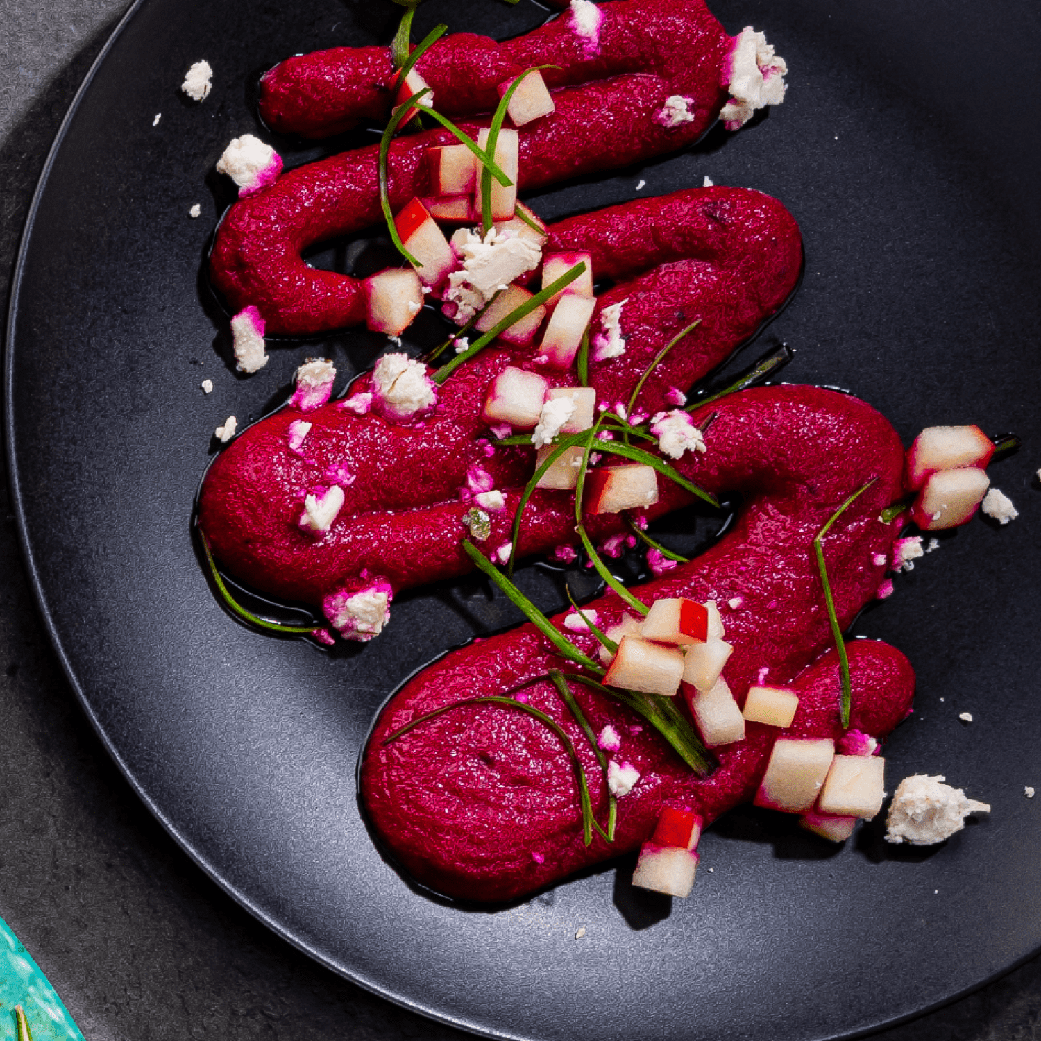 - To plate, place the purée in a bowl or plate, and garnish with apples, onions and feta.