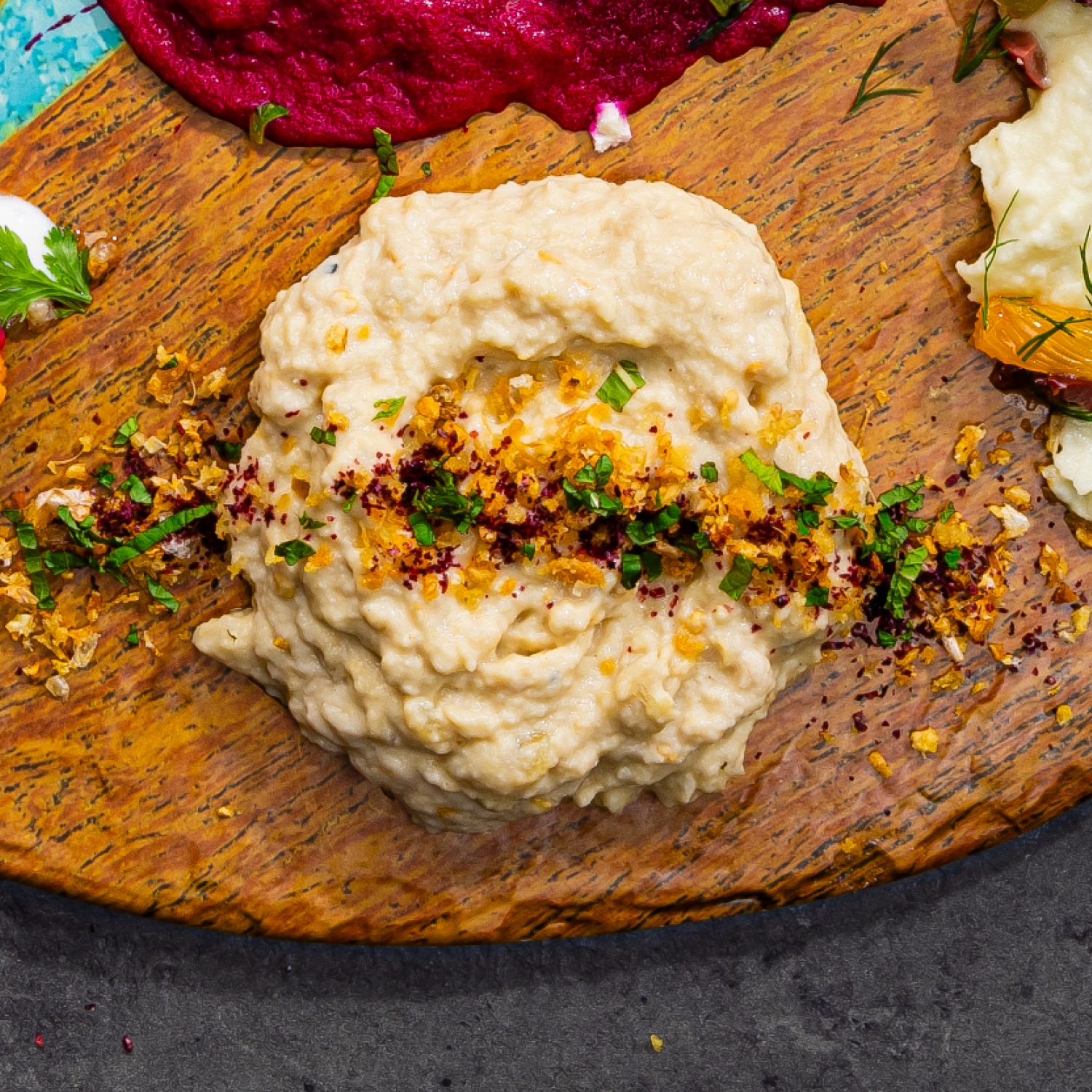 - To plate, place the purée on a plate or board, and garnish with mint, fried garlic, olive oil, and sumac. Serve with pita or pita chips.