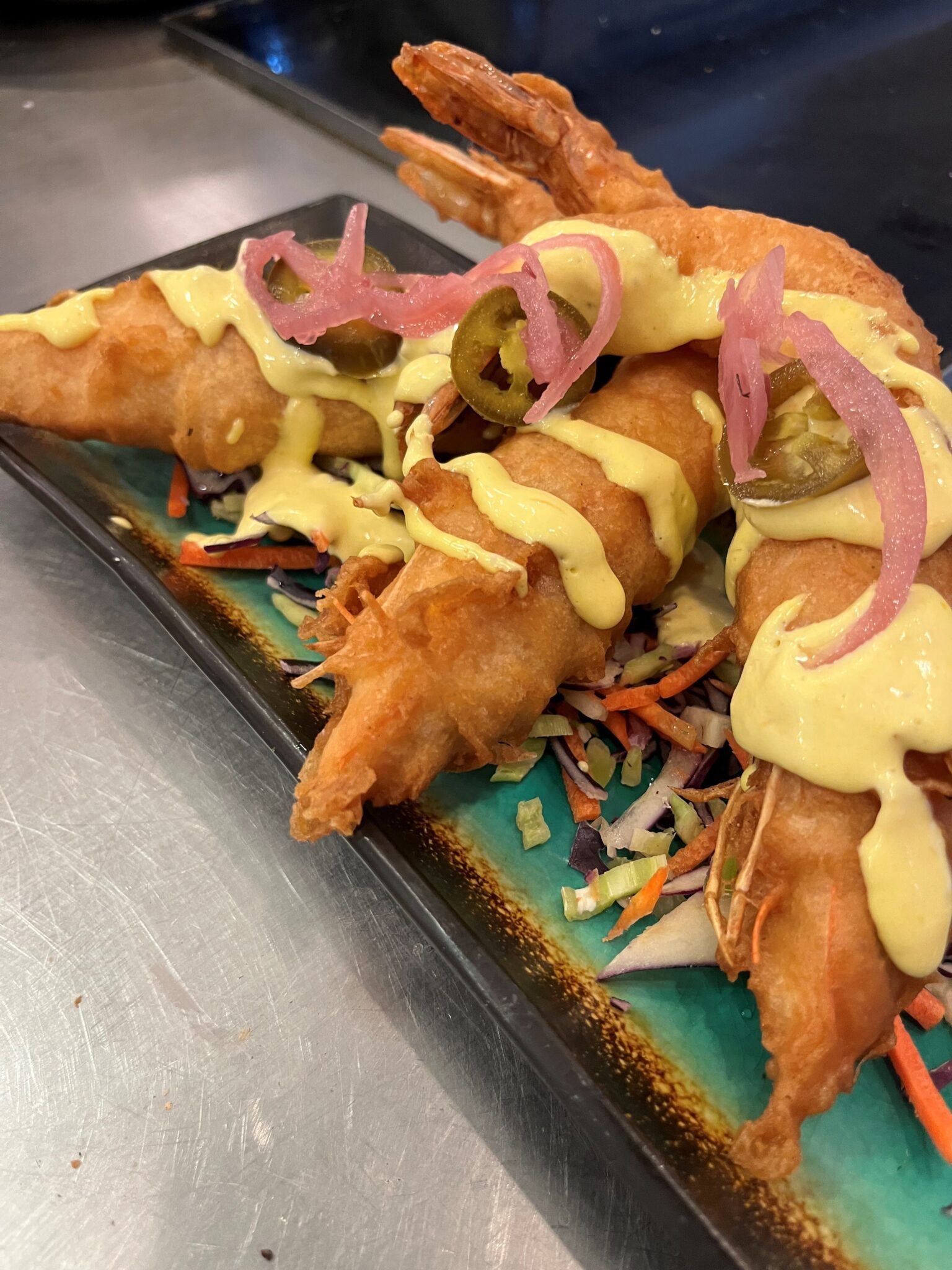 - To plate, dress broccoli slaw in oil, salt/pepper and plate down center of plate. Keeping in straight line. Layer cooked shrimp on top of slaw, shingle style, keeping tail up. Drizzle Ahi Aioli over each shrimp, about 1.5 teaspoon on each shrimp. Lay (1) piece of jalapeno on each shrimp and spread the pickled red onions over top.