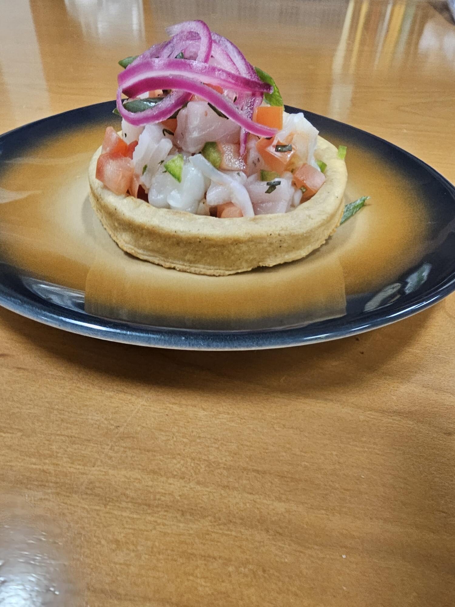 Add ceviche mix and garnish. Optional garnishes- radish, fresh