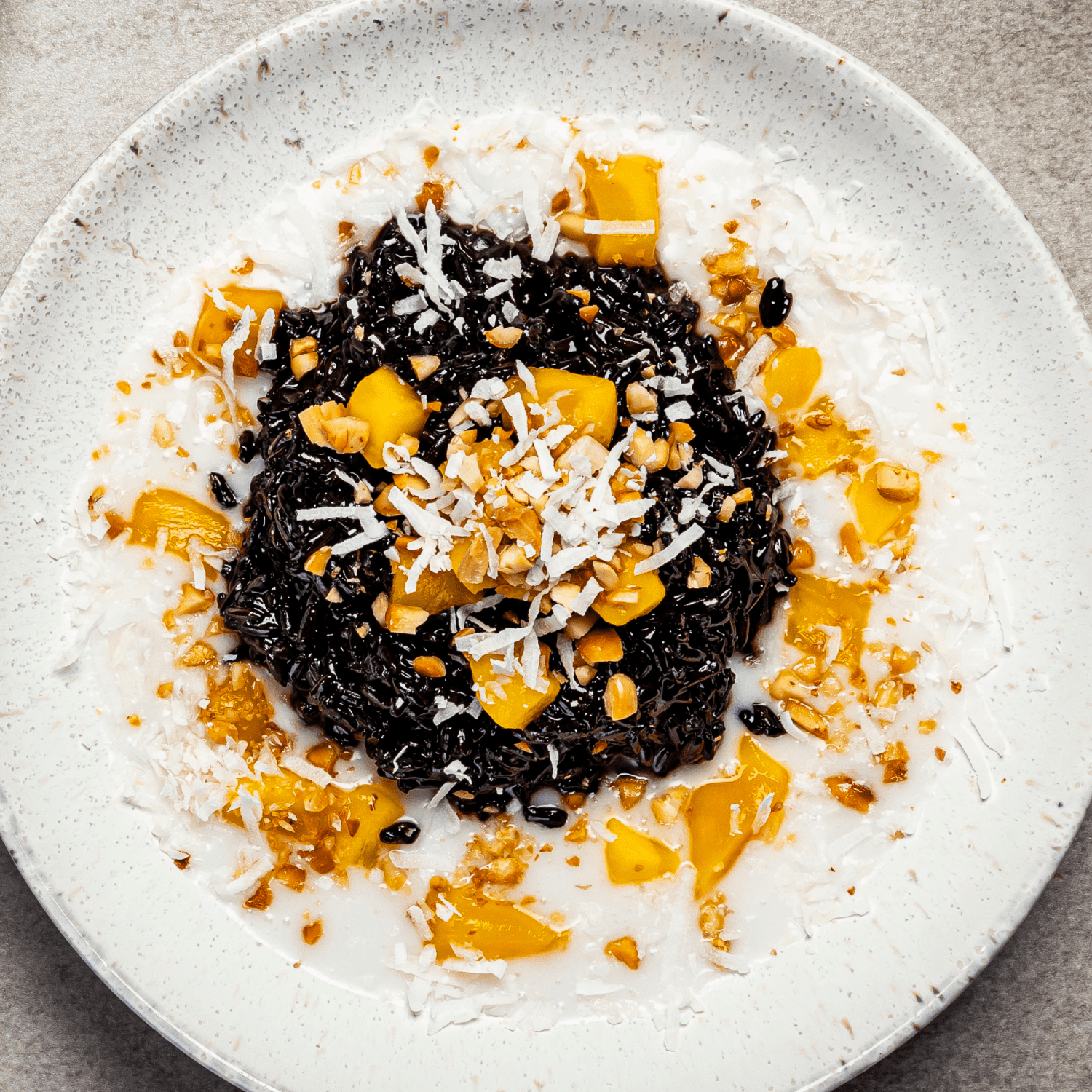 - Serve rice pudding topped with coconut milk, mango, coconut, and peanuts.